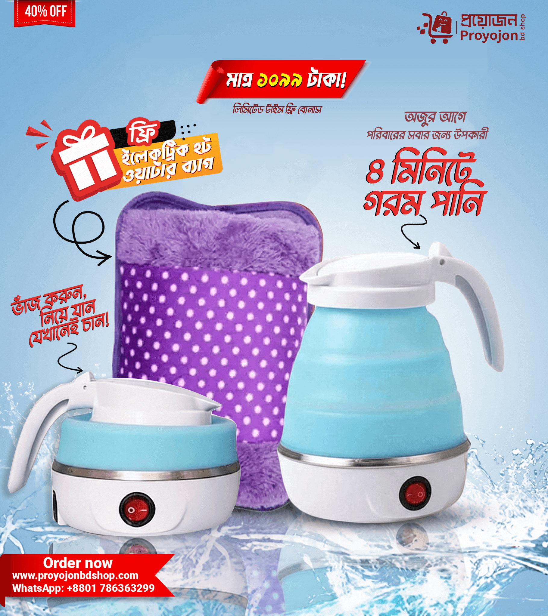 Foldable Electric Kettle – ফোল্ডেবল ইলেকট্রিক কেটলি (৬০০ মি.লি.) – ফ্রি ইলেকট্রিক হট ওয়াটার ব্যাগসহ